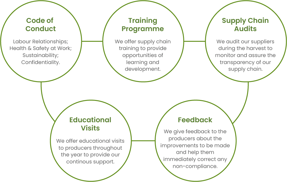 The wellbeing and living standards of our rural workers are always central to our concerns and activities. With a combination of supply chain training, educational visits to producers, audits of suppliers during the harvest to monitor and assure transparency, and feedback to producers about the improvements to be made and help to implement these, the programme’s impact has been far reaching.